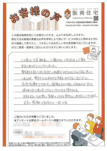 築年数も経っており売却に時間がかかるのだろうと不安に思っていましたが、雪村さんのおかげで半年もかからないスピードで売却する事ができました。説明も分かりやすく、何かあればすぐに現地へ向って見に行って下さり、アドバイスも頂きました。