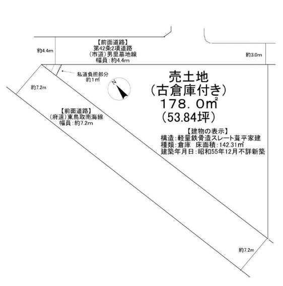 上物有り、建築条件なし、角地、公営水道(引込なし)、公共本下水(引込有・接続なし) |