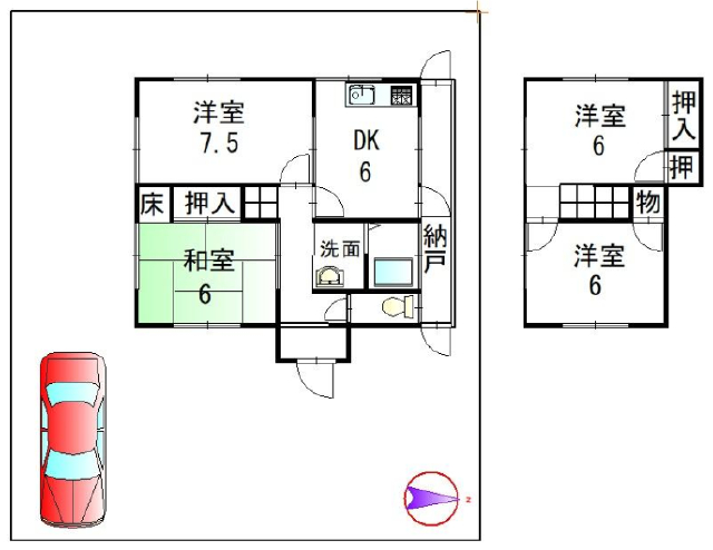 空家、駐車場、公営水道、集中浄化槽(維持管理月額費要)、都市ガス、増築未登記(約10.82㎡) |