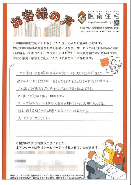 お人柄か誠意あるご対応にこころより感謝申し上げます。