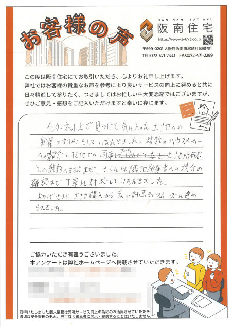 インターネット上で見つけて気に入った土地への新築の対応をしていただきました。複数のハウスメーカーへの紹介と現地での同席から、土地所有者との契約や対応まで、さらには隣地所有者への境界の確認まで、丁寧に対応していただきました。