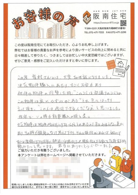 中古物件購入にあたり、すごく不安もあり何件か物件の内覧した時、“このシミは雨漏りのシミとかこの物件は床にひずみがある”とか色々はっきり言って頂き、“この人は信用できる人だなあ”と思いました。