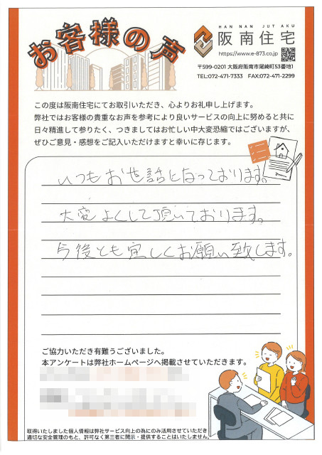 初めての大きな契約で夫婦共に緊張していましたが、雪村さんとの会話で自然と気持ちがほぐれ、リラックスして契約する事が出来ました。わからない事は丁寧に説明していただいたり、変更点や確認事項があればこまめに連絡を下さるなど丁寧に対応して頂きました。心より感謝しております。
