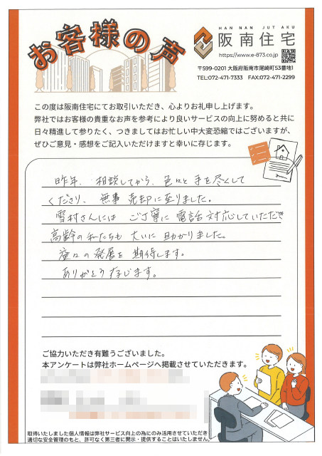 昨年、相談してから色々と手を尽くしてくださり、無事売却に至りました。